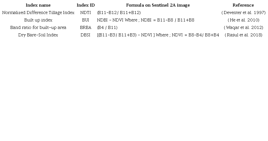 Our findings coincided with ( Osgouei et al. 2019; Rouibah & Belabbas 2020) research, that pointed out that the multi-index method including the NDTI index, is the most efficient to increase the accuracy of the extraction and the separation between bare land and built-up areas, where The developed dataset that has been tested in this new region showed effectiveness in the mapping of urban areas.