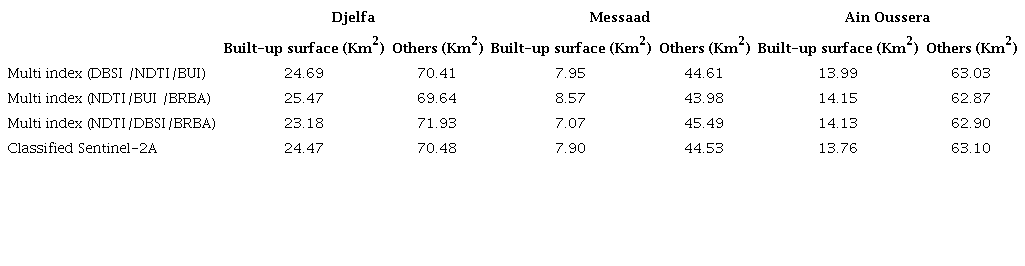 According to the value of the surface area of the multi-index images and the classified sentinel 2A image in Table 5, the built-up class of the multi-index closest to the same class of the classified sentinel 2A image in the cities of Djelfa, Messaad, and Ain Oussera is resulting from the multi-index (DBSI /NDTI/BUI) with 24.69 km2, 7.95 km2, and 13.99 km2 respectively.