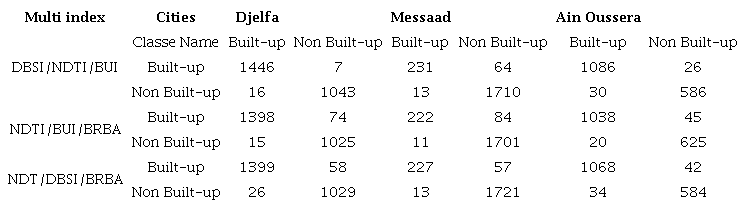 The confusion matrix which consists of classified built-up statistics and non-built-up points was generated for every city in Table 7. It is generally observed in regions of the study area that the multi-index (DBSI/NDTI/BUI) had a low misclassification of built-up area compared to other multi-index, which makes it possible to reduce the complexity of mixing the built-up and the bare soil.