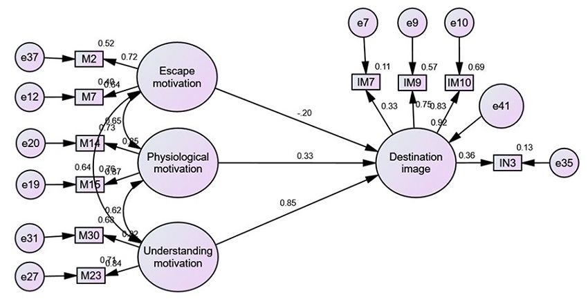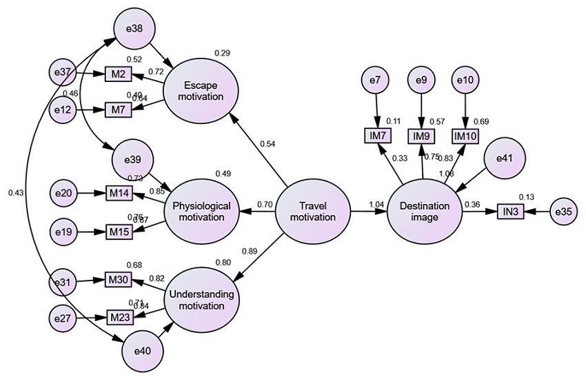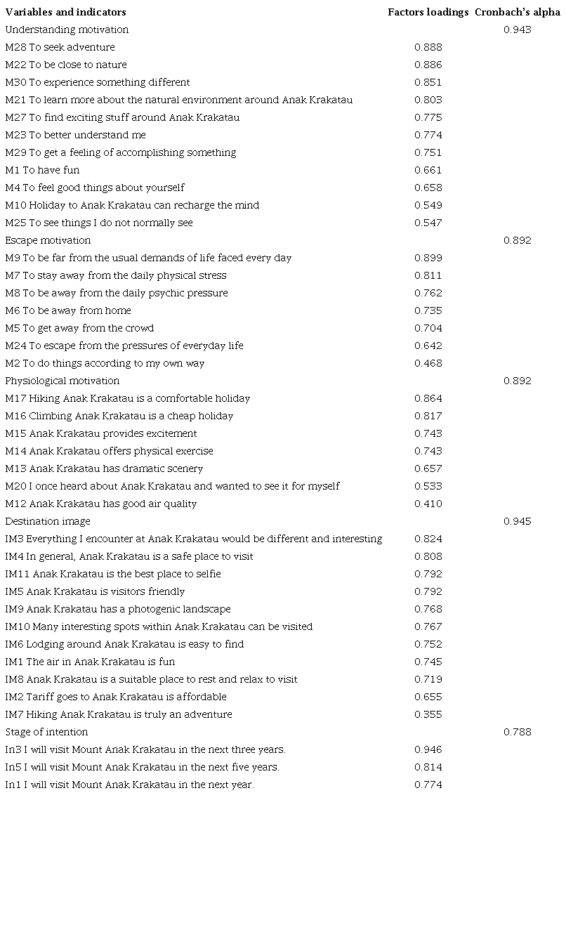 Table 2 indicates results of data validation and reliability tests. There were four variables tested including travel motivation, destination image, and stage of intention. Based on the calculation, travel motivation consisted three dimensions including understanding motivation, escape motivation, and physiological motivation. Understanding motivation survived 11 indicators with a Cronbach’s alpha score of 0.943. Escape motivation contained seven indicators with a Cronbach’s alpha score of 0.892. Physiological motivation consisted of seven indicators with a Cronbach’s alpha score of 0.892. Furthermore, destination image had nine indicators with a Cronbach’s alpha score of 0.945. Moreover, destination image kept nine indicators with a Cronbach’s alpha score of 0.945 while stage of intention owning a Cronbach’s alpha score of 0.788 with three indicators.