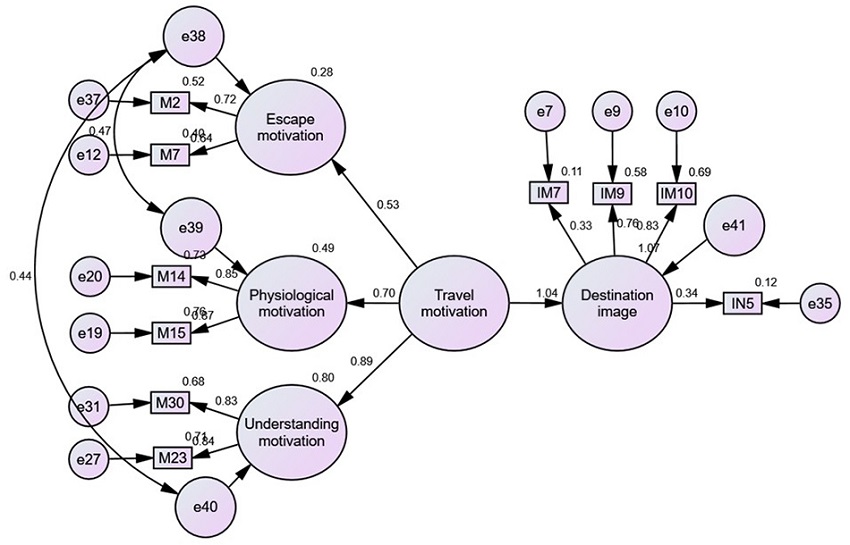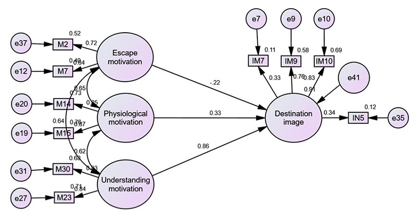 Figure 4 shows three dimensions of travel motivation were linked to destination image and destination image was linked to travel intention in the next three years. This fitted model had probability, CMIN/DF, CFI, and RMSEA scores of 0.155, 1.264, 0.992, and 0.033, respectively.