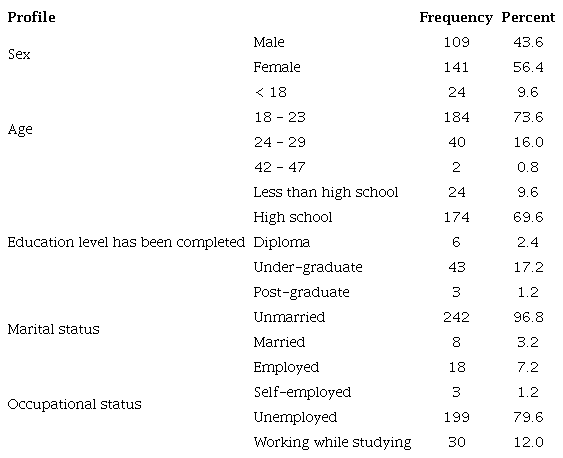 Table 1 shows the profile of participants. This study attracted 250 participants consisting of 109 males (43.6%) and 141 females (56.4%). Furthermore, 33 of the participants were visited a volcano. In addition, 31 participants claimed that they have visited Anak Krakatau. Twenty-one participants have visited it once, 13 participants have visited it twice, and three participants have visited it three times. With regard to age, the largest age group of participants was between 18 to 23 years consisting of 184 participants (73.6%). Followed by an age group of less than 18 years consisting of 24 participants (9.6%). Furthermore, 174 participants (69.9%) hold a high school diploma, followed by those who hold a diploma consisting of 43 participants (17.2). The majority of participants were unmarried, which was 242 participants (96.8%) and the majority of them were not working, i.e. 199 participants (79.6%).