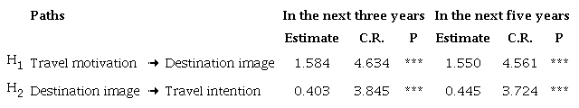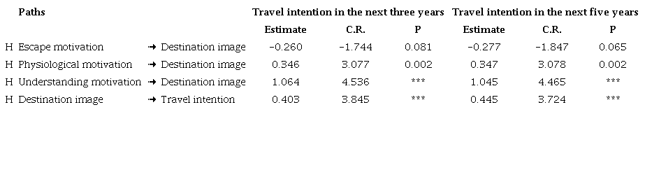 Table 4 shows the results of the two modification models tested. The effects of the modification of the first model with 'travel intention the next three years', escape motivation has a value of C.R. equal to -1,744, which indicates that this path is not significant. This result also applied to the modification of the second model with 'travel intention in the next five years' which has a value of C.R. amounting to -1,847. In contrast to the two results, physiological motivation and understanding motivation significantly influenced the destination image, and this applied in both models. Also, destination image has a significant impact on the stage of travel intention. An effect of a variable on other variables is said to be significant if the value of C.R. greater than 0.05.