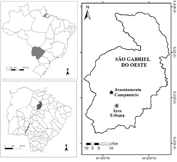 A área de estudo abrange dois lotes do Assentamento Campanário, onde é praticada a atividade suinocultora. Se encontra a 650 metros de altitude (Google 2019) e está localizado na área rural do Município de São Gabriel do Oeste, distante 16 km da sede municipal, no Estado de Mato Grosso do Sul (Figura 1).