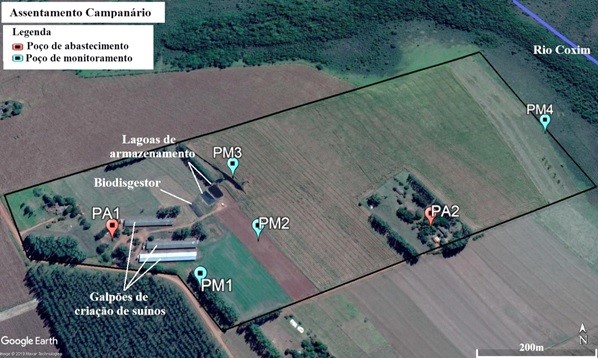A área de estudo possui três granjas que abrigam em média 1000 suínos cada e o efluente gerado da atividade suinocultora passa por dois sistemas de tratamentos antes de ser disponibilizado para fertirrigação dos campos, um biodigestor anaeróbio e duas lagoas de armazenamento.