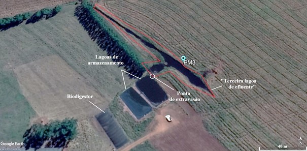 A anomalia verificada no poço PM3, localizado imediatamente a jusante das lagoas de armazenamento de efluente do biodigestor, é justificada pelo uso de lonas plásticas de polietileno em vez de geomembranas de PEAD ou PVC, que são, geralmente, recomendadas para impermeabilizações de lagoas de biodigestão e de armazenamento, bem como pela ausência de manutenção da impermeabilização das lagoas desde que os sistemas de tratamento foram desenvolvidos no Assentamento há cerca de quinze anos. Adicionalmente, deve-se considerar a presença de extravasamento de efluente suíno da segunda lagoa, agravada pelo período de chuvas, visualizado durante duas visitas ao Assentamento em 08/06 e 16/11/17. Parte desse vazamento se acumulou a jusante das lagoas e formou uma “terceira lagoa de efluente”, localizada a menos de cinco metros a montante do poço PM3. Por meio do Google Earth foi possível visualizar a presença e a distribuição em área do vazamento e da “terceira lagoa”, delimitada em vermelho na Figura 3, em imagem de satélite tirada em 14/07/17. Essa situação foi controlada por meio da aplicação do efluente acumulado nas áreas de cultivo e nas pastagens, não tendo sido mais observado em visitas posteriores.
