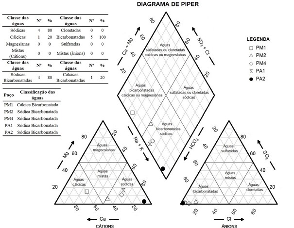 A partir dos resultados da análise hidroquímica das águas dos poços da área experimental foram realizadas a caracterização básica e a classificação das águas subterrâneas por meio da elaboração do Diagrama de Piper, diagrama trilinear que classifica as águas (Fetter 2001), utilizando o software livre Qualigraf (Möbus 2009).
