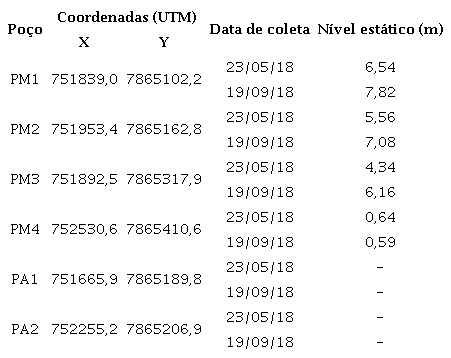 A localização dos poços amostrados (Tabela 1) foi georreferenciada por meio de aparelho de GPS (Global Position System) e antes de iniciar cada coleta foi feita a medição do nível estático dos poços de monitoramento (Tabela 1). Os poços de abastecimento possuem um sistema de captação por bombeamento com ausência de orifício que possibilite a medição do nível da água.