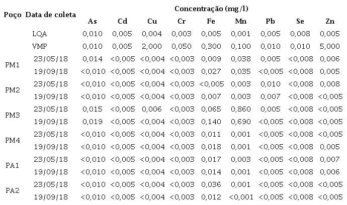 Por não atuar no metabolismo humano, os metais As, Cd e Pb são altamente tóxicos (Agency for Toxic Substances and Disease Registry - ATSDR 2012a ; Holland et al. 2005; Von Sperling 2005). Considerando que o limite de potabilidade para consumo humano do As é de 0,010 mg/l (Brasil 2008; 2017), o PM1 na campanha 23/05/18 e o PM3 nas duas campanhas apresentaram valores acima do VMP. Como o metal não foi detectado nos demais poços dentro do LQA (0,010 mg/l), é possível afirmar que estejam dentro dos padrões de potabilidade da legislação brasileira. O Cd não foi determinado dentro do LQA (0,005 mg/l) e o Pb foi detectado nos poços PM1 e no PM3 na primeira campanha e no PM2 nas duas campanhas. Ambos estão abaixo do VMP de potabilidade para consumo humano conforme legislações pertinentes, 0,005 e 0,010 mg/l (Brasil 2008; 2017), respectivamente.