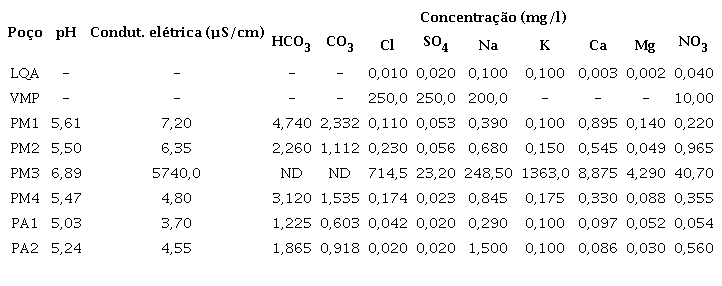 Os parâmetros Cl, SO4, Na, K, Ca, Mg e NO3 estão dentro dos limites estabelecidos pela legislação e para águas naturais (Brasil 2008; 2017) com exceção do poço PM3, que apresentou alterações expressivas em relação aos demais poços, corroborando os elevados valores da condutividade elétrica verificados no mesmo. Além disso, também foram verificadas concentrações mais elevadas de As, Fe e Mn no PM3 em relação aos demais analisados (Tabela 2).