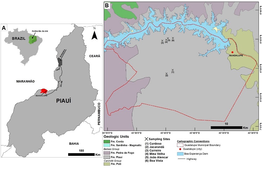 In Brazil, the main palygorskite deposits are in the municipality of Guadalupe in the state of Piauí and are distributed in an area of about 700 km2 ( Luz & Lins 2008). Guadalupe is located in southwest Piauí, bordering the state of Maranhão in the north, and is 345 km from the state capital Teresina ( Figure 1A).