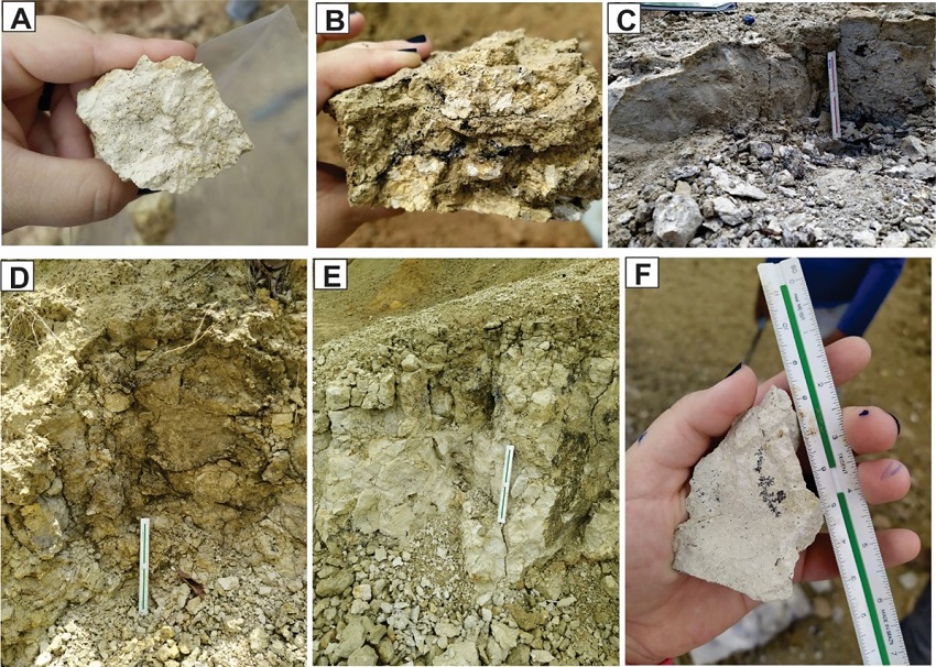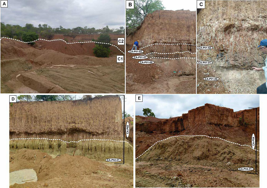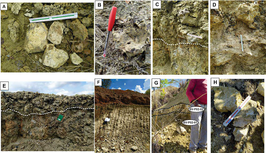 At the site called Mina Velha, an abandoned mine that was last worked in the 1980s, a change in the behavior of the deposit was observed in relation to the other sites. The mine front profile of Mina Velha is approximately 10 meters high, with a topsoil followed by a soil-rock transition zone and a thick layer measuring approximately 75 cm of silexite ( Figure 4C and E). The clayey ore layer at the base of the sequence contains dispersed occurrences of silexite. In the region, the silexite is called “fire stone” and hinders advance the ore extraction ( Figure 4B). Above the silexite-rich level there is another clayey layer, where the MV-P03-01 sample was collected ( Figure 4D).