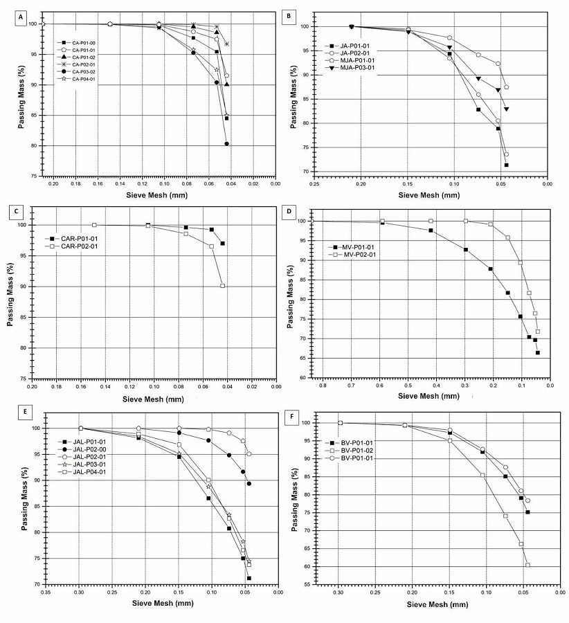 Figure 5 presents the graphs of the particle size distribution of the samples. All samples had more than 60% passing mass in a sieve of 0.044 mm (44 µm). Sample BV-P01-01 had the lowest yield from this process, in which 60.44% was below 44 µm. The samples CAR-P01-01 and JAL-P02-01 showed the highest yields, with 97% and 95.08% of fraction with particle size smaller than 44 µm, while the two samples collected at Carrero site showed the best yield ( Figure 5C), having more than 90% passing mass through the 44 µm sieve. The two samples from Mina Velha ( Figure 5D) had coarser particle size, with mass retained by the sieve with mesh of 0.210 mm and 66.40% (MV-P01-01) and 71.80% (MV-P02-01) yield of the fraction with particle size smaller than 44 µm.