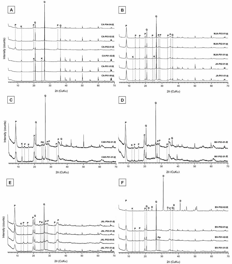In the samples collected at the Jacarandá mine, the presence of kaolinite was not identified in samples MJA-P03-01 and MJA-P02-01, where it only appeared in samples JA-P01-01 and JA-P02-01 ( Figure 6B). The samples from Carrero ( Figure 6C), Mina Velha ( Figure 6D) and João Alencar ( Figure 6E) were composed of palygorskite, kaolinite and quartz, and no differences were observed in the diffractograms of the samples collected from the same site.