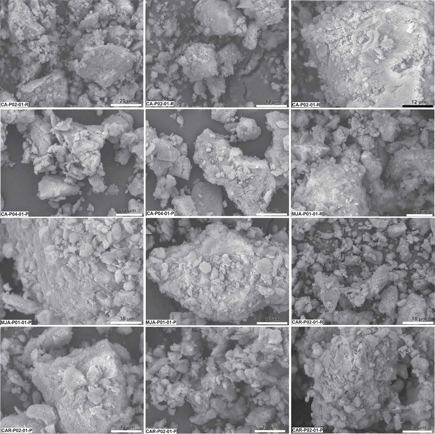 The mineralogical characterization of the raw samples (R) and processed fractions (P) was performed using X-ray diffraction (XRD) by the powder method, in a Bruker AXS D8 Advance Eco diffractometer, with CuKα radiation (40 kV/25 mA), with 0.02º 2ɵ step and counting time of 0.52 seconds per step, coupled to a LynxEye XE silicon drift (with energy discrimination), collected from 4º to 70º 2ɵ. Qualitative spectrum interpretation was performed by comparison with patterns contained in the relational database PDF 4+ (ICDD, 2014) in the Bruker Diffrac EVA software. The microtextural study was carried out with A Hitachi TM3030 Plus microscope, equipped with a Bruker Quantax energy dispersion system (SEM/EDS) for chemical microanalysis to identify minerals, their composition and textural relationships. Density analysis was performed using Micromeritics AccuPyc II 1340 helium pycnometer.