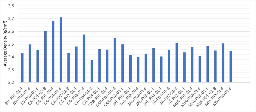 The results of the density analysis using the helium pycnometer indicated that the samples had a density between 2.38 g/cm3 (CA-P04-01-B) and 2.71 g/cm3 (CA P01-02-F) ( Figure 8), with the average density of the constituent minerals being 2.15 g/cm3 for palygorskite, 2.62 g/cm3 for quartz, 2.6 g/cm3 for kaolinite and 2.84 g/cm3 for dolomite. The samples with greater density were those that did not show a peak of palygorskite in the X-ray diffraction (the samples collected in the CA-P01 profile). With the exception of these samples, all the others only had approximate values, so it is not possible to state that a site of occurrence had ore with different density than others.