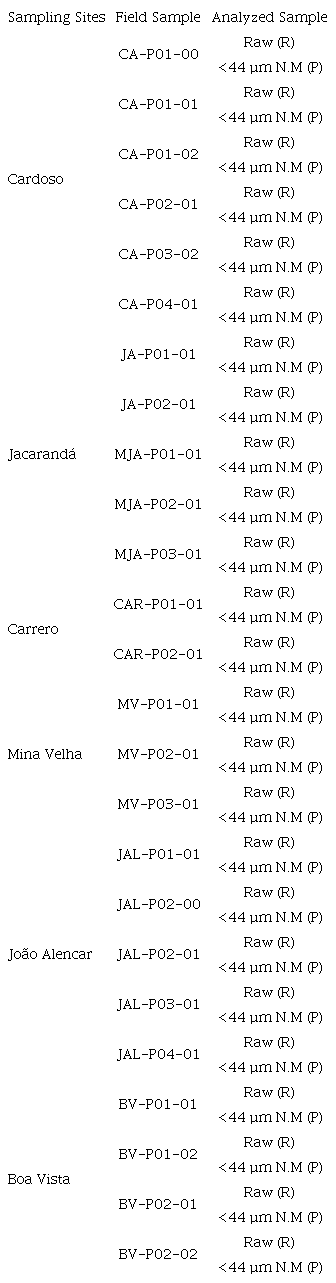 At the Mineral Technology Center (CETEM), the samples were dried at room temperature, crushed in a jaw crusher and homogenized using the prismatic pile method. The aliquots separated for processing (1 kg) were wet milled in a bar mill, the wet classified with a vibrating classifier with a set of sieves of 212, 150, 104, 74, 53 e 44 µm. The fractions retained in each sieve were dried in an oven at around 60 oC and weighed. The fractions smaller than 44 µm were passed through a BoxmagRapid magnetic separator with high intensity magnetic field (15,000 Gauss). The non-magnetic fractions were filtered in a filter press (5 bar), and dried in an oven at around 60 oC. At the end of this process, the non-magnetic fractions with particle size smaller than 44 µm (<44 µm N.M - F) were generated, which together with the raw samples (R) were used in the analyses ( Table 1).