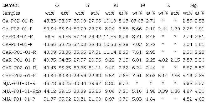 The X-ray diffractograms indicated that most of the samples had similar mineralogical composition, consisting predominantly of palygorskite, quartz and kaolinite. The BV-P02-02 sample was the only one that contained dolomite together with the minerals already mentioned. It was present in layer above the clayey layers exploited in the Boa Vista mine. In the regional geological context, the Pedra de Fogo Formation is marked by this intercalation of sandstone with flint, limestone and shale ( Araújo et al. 2016; Goés, Souza & Teixeira 1990). Other differences observed were the absence of kaolinite peaks in samples MJA-P02-01 and MJA-P03-01 and absence of palygorskite peaks in samples CA-P01-00, CA-P01-01 and CA-P01-02.