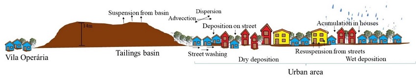 The conceptual model (Figure 2) is a synthesis of the information obtained through the collection of pre-existing data and field visits, indicating the tailings basin as a source of contamination and the urban area of the municipality representing the receiving environment. The proximity between the tailings basin and the urban area submits the latter to continuous and elevated exposure of contamination by aerial transport. Following our hypothesis, we assume that lead particulates become suspended from the tailings basin into the atmosphere, where they are transported by the turbulent action of wind in advective and dispersive ways. During transport, the particulates may be deposited in both streets and houses. Particulates in the streets tend to be resuspended by the wind, while those deposited indoors remain inactive and accumulate.