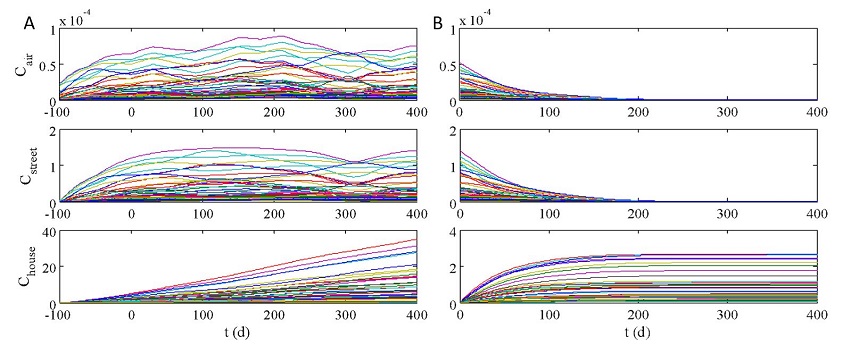 The simulated lead concentrations in the model cells, where field data is available (Figures 1C and 1D) are represented in Figure 4A showing an initial transience due to model warm-up of approximately 100 days. After this period, the influence of the initial conditions (all concentrations zero outside the basin) vanishes and the simulated concentrations in the air and streets reach a quasi (periodic) steady-state with a repetition of the same variability on an annual basis. This is due to the periodic wind regime adopted in Figure 1B as a driver for lead transport. In contrast, the concentration pattern in the houses presents a relatively constant accumulation.