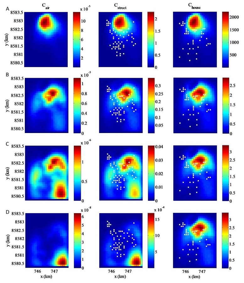 The simulated concentrations for model calibration (Figure 3) and spatial representation (Figure 5A) were obtained as the values at t = 400 d in Figure 4A. Near the basin, simulated values of Cstreet varied from 1 to 1.5 μg/m2. For the accumulated concentrations Chouse inside the houses, we multiplied the respective accumulation during the final 365 days of the simulation by the exposure time of the basin (50 years), obtaining concentrations ranging from 1000 to 1500 μg/m2 near the basin (Figure 5A). Using Equation 4 and inspection of Figure 4A further show that μg/m2, i.e. significantly below Cstreet, which is on the order of 100, and Chouse on the order of 103. As to be expected, this reflects that most of the lead is concentrated in the houses, followed by streets and suspended in the air. This is consistent with previous studies (Fung, Yang & Zhu 2014; Leung 2015) showing higher contaminant concentrations in internal areas with respect to outdoor.