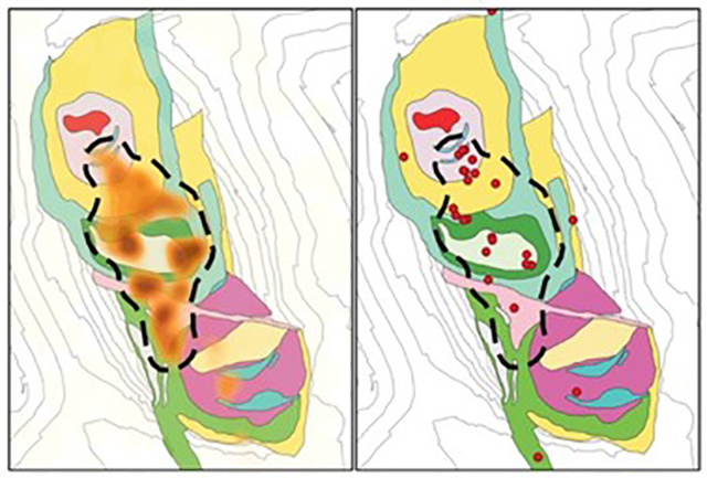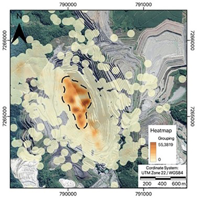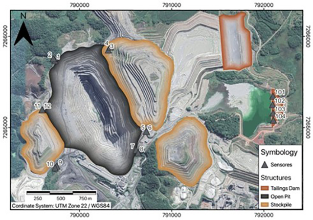 CMC microseismic system consists in a set of sensors that comprises 12 geophones installed in deep boreholes (∼330 m) and 4 geophones in shallow holes (∼50 cm) covering respectively the open pit and the tailings dam, recording data in a 24-hour and near real-time monitoring regime (Figure 9).