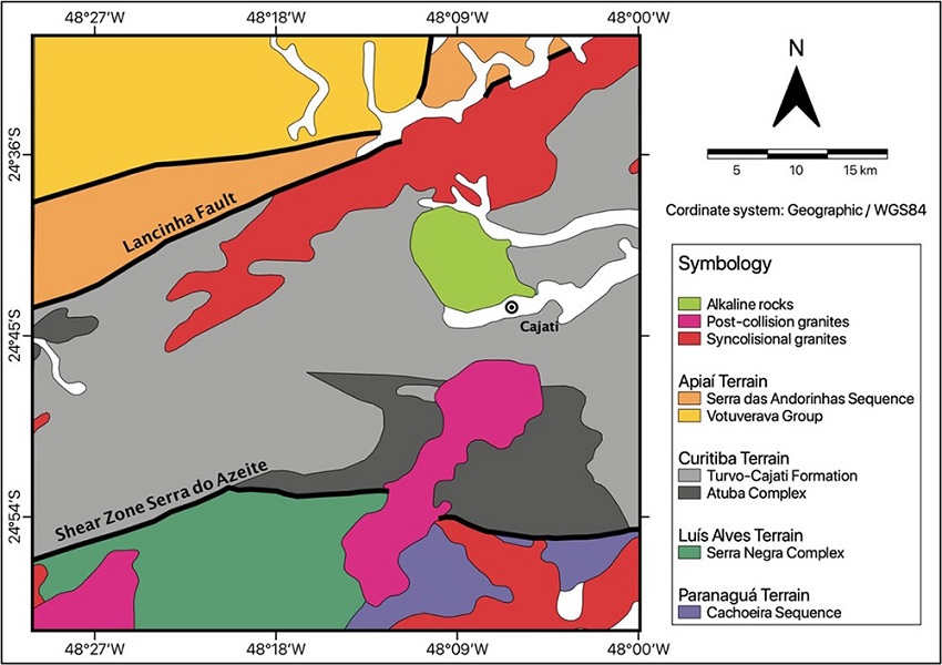 This region and its surroundings are part of the center-south portion of the Ribeira Belt, and four geotectonic units are currently found, individualized based on different lithological, structural, and isotopic characteristics, called Apiaí, Curitiba, Luís Alves and Paranaguá Terrains (Figure 2), resulting of the collision between the cratons of São Francisco, Congo, Paranapanema and Rio de La Plata.