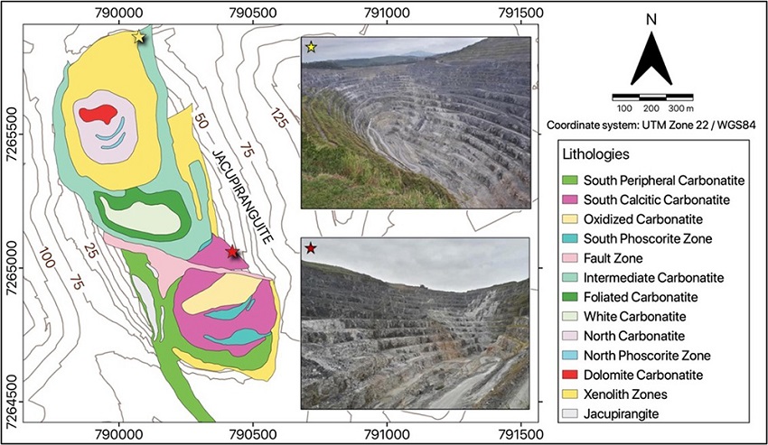 The mining site is located in the Jacupiranga Intrusive Suite (JIS) that is composed by alkaline affinity clinopyroxenites (jacupiranguite), dunites associated with carbonatites and unsaturated alkaline rocks (ijolites and clinopyroxenites), with basic terms for alkaline subvolcanic acids like gabbro and syenites.