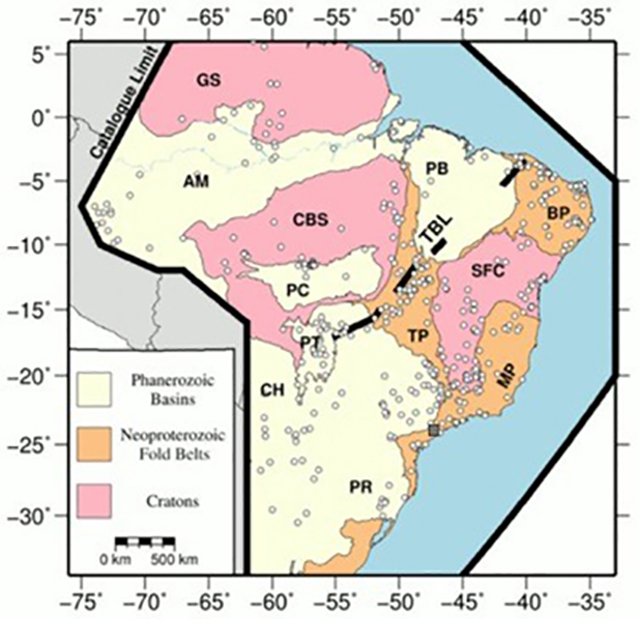 Agurto-Detzel et al. (2017) investigated the correlation between seismicity and geotectonics provinces, besides other correlations (e.g., non-rifted interior versus passive margins, crustal thickness, gravity anomaly), and has identified that Neoproterozoic fold belts were found to be significantly more seismic than Phanerozoic basins and cratonic areas (Figure 4).