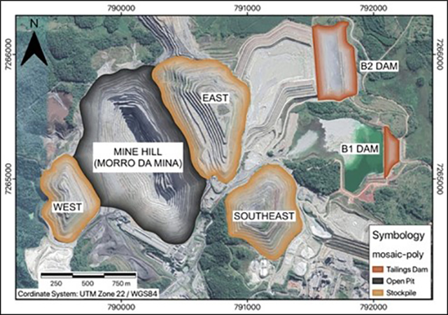 CMC infrastructure is composed of an open pit, two stockpiles and two tailings dams (B1 and B2) (Figure 7). According to Kuckartz (2017) the open pit bottom is located around the elevation ∼170 m with the plan to advance 100 m in depth, the global angles of the current slopes are around 57o (operational and future) with benches varying between 10 to 20 m in height.