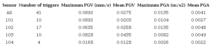 For ground motions measured in the dam crest, the values of PGV varied from 0.0024 to 0.0892 mm/s and the values of PGA varied from 0.0003 (0.0024% of g) to 0,0135 (0.1383% of g) m/s2. Table 1 shows the trigger statistics discriminated by sensors.