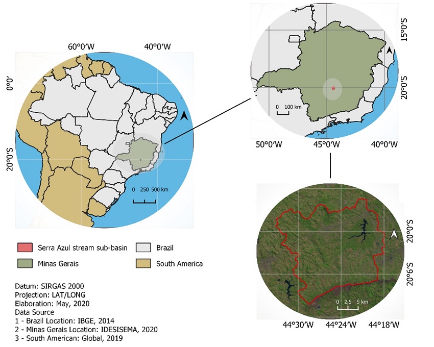 The Serra Azul stream sub-basin is especially important for the water supply of Belo Horizonte Metropolitan Region because of the presence of a water supply reservoir managed by Companhia de Saneamento de Minas Gerais (COPASA in Portuguese). This region is located between the parallels 20º 15 'and 20º 00' south latitude and the meridians 44º 15 'and 44º 35' west longitude (Figure 1), encompassed in the municipalities of Mateus Leme, Igarapé, Juatuba and Itaúna (Dutra et al. 2021; Dutra, Brianezi & Coelho 2020; Dutra, Elmiro & Garcia 2020).