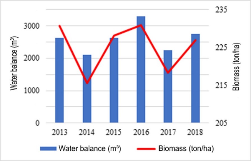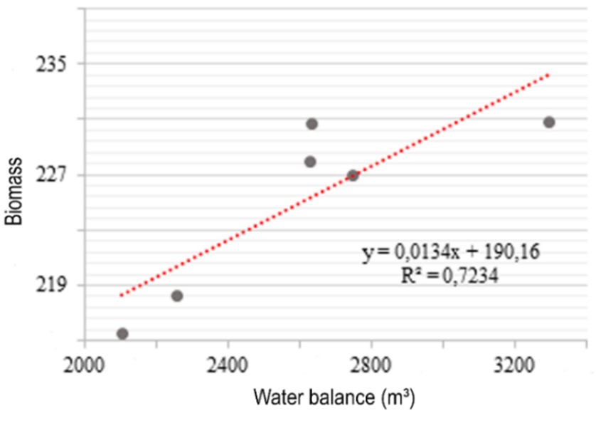 The strong positive relationship between forest areas and water balance (Figure 9) indicates that land use changes influence on the carbon storage. Over the time series, it was found that a reduction in the water storage volume implies a decrease in the average biomass storage in the study region (Figure 10).