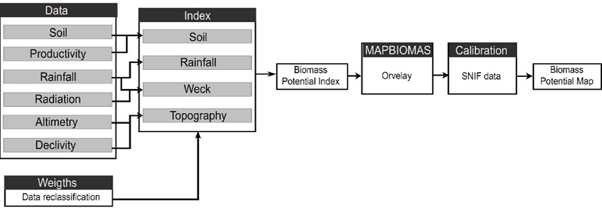 Equation 3, proposed by Iverson et al. (1994), was used to calculate the potential biomass of the region. According to Martins et al. (2009), the calculation is performed by creating four indexes, namely: Modified Weck Climate Index (MWCI); Rainfall Index (RI), Soil Index (SI), and Topography Index (TI). The weights were obtained according to the adaptations presented by Martins et al. (2009) for Iverson et al. (1994) methodology, where each index layer received a weight varying from zero to 25, so that the maximum final result obtained is equal to 100 (see supplementary material).
