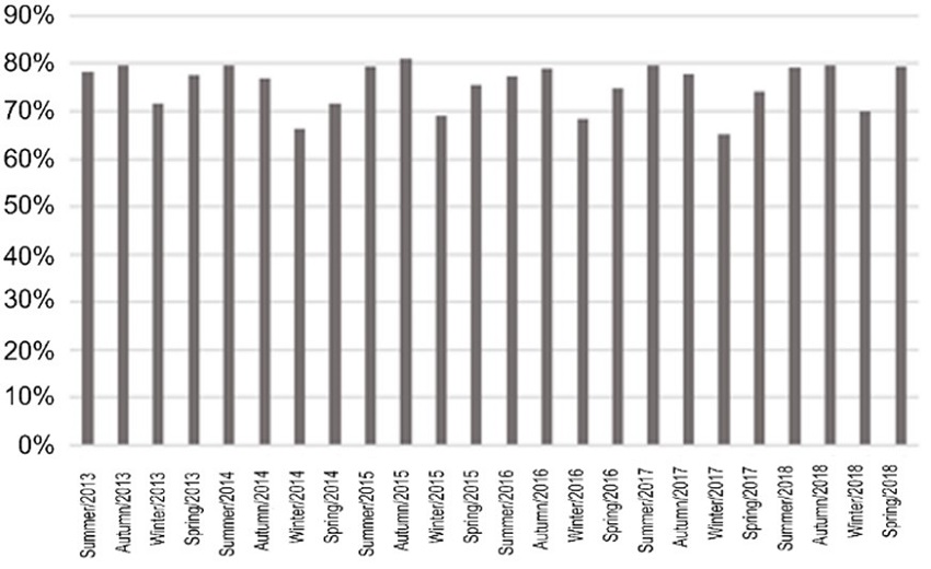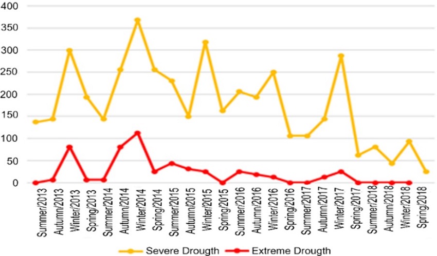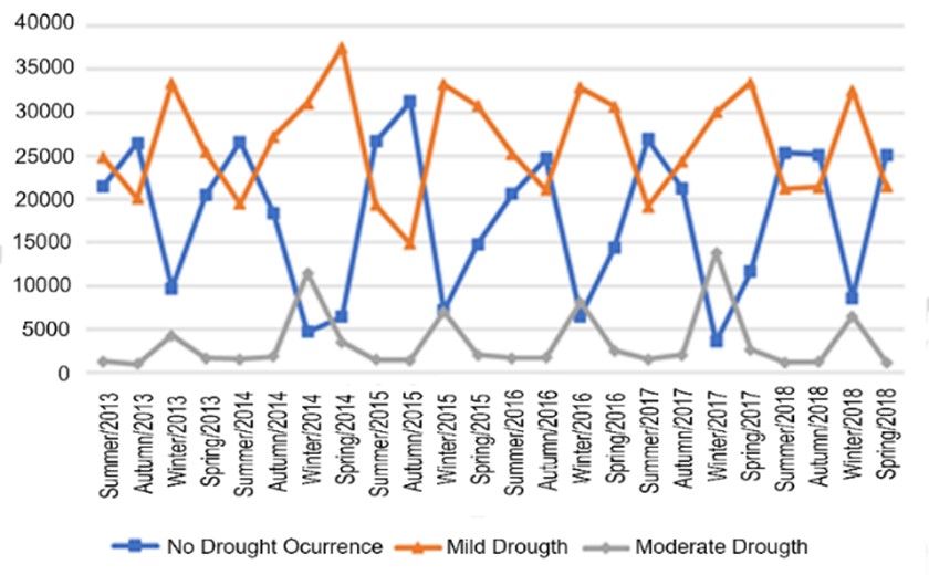 The average seasonal variation of the VCI values in the study region indicated the majority of pixels, in a large part of the region, belonging to the classes of mild drought and without occurrence of drought as indicated by the variation of the VCI data between 60% and 80% (Figure 3). The presence of seasonality in the study region was identified by the lowest values of VCI in the driest periods, between the autumn and winter seasons, over the time series (2013-2018).