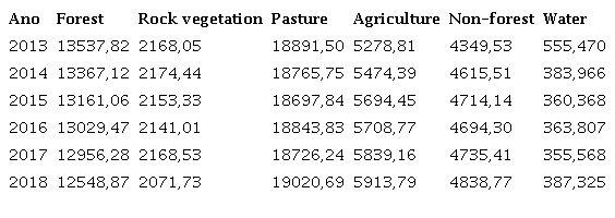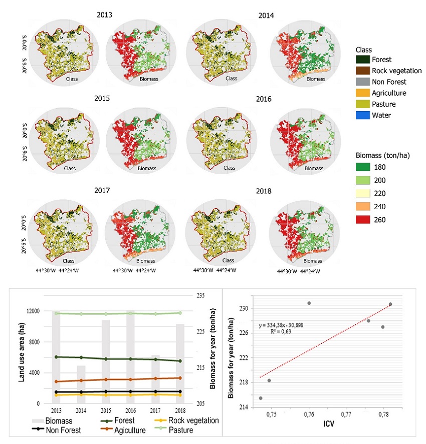 The study region is located in an area of transition from rural to urban use, where the most properties are composed of pasture, forest and agricultural areas (Figure 7). Inside the rural properties, the increase of anthropized areas caused the decrease of average biomass, showing values between 0 and 72 ton/ha. In the year 2013, the forests showed the highest amount of biomass while the lowest value of the time series occurred in the next year, with a value of 214.174 ton/ha.