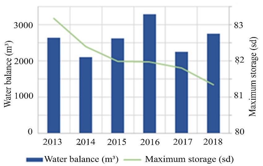 The results identified the decrease of maximum storage (Sd) over the time series (Figure 8). Furthermore, it can be seen that the increase in the water volume has not contributed to the increase of Sd. In the year 2016 for instance, it can be observed that the water amount stored was the highest in the period, but the Sd showed a tiny increase. This mismatch suggests the influence of other factors decreasing the water storage.