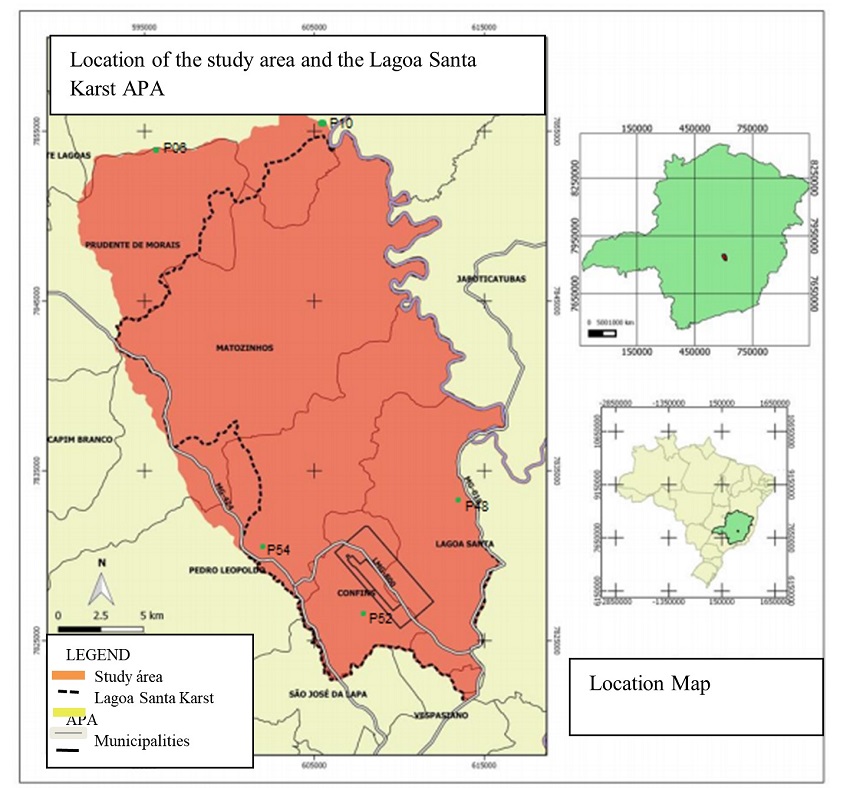 The study area is located 30 km north of Belo Horizonte (State of Minas Gerais, Brazil), extending for ca. 500 km². Created by the Federal Government via Decree 98881 dated 25th January 1990, the Environmental Protection Area (APA) named Lagoa Santa Karst is 356 km2 in area and encompasses part of the Lagoa Santa, Pedro Leopoldo, Matozinhos, and Funilândia municipalities. It is located in the Minas Gerais karstic region, where limestone predominates in the formations that compose the Bambuí Group (Pessoa 2005).