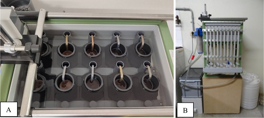 1) The 26 Gleysol samples were collected at depths from 0-5 to 20 cm by inserting a metallic cylinder in the soil; 2) Sample saturation in the laboratory, using a 0.005 M deaerated solution of calcium sulfate (CaSO4) saturated with thymol (C10H14O). The samples were kept soaking for seven days (Figure 2A), until the beginning of the essays. A constant-head permeameter was used to determine the permeability of the soil samples (Figure 2B). The difference in volume measured with a burette is the volume of solution drained through the sample in a chosen time interval. The same laboratorial procedure was applied to the 114 Argisol, Cambisol and Latosol samples.
