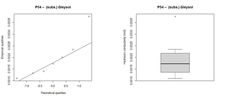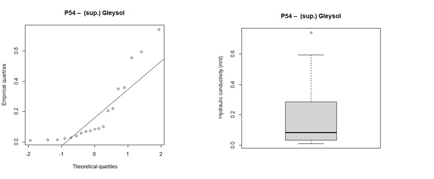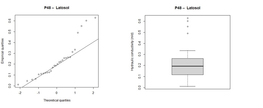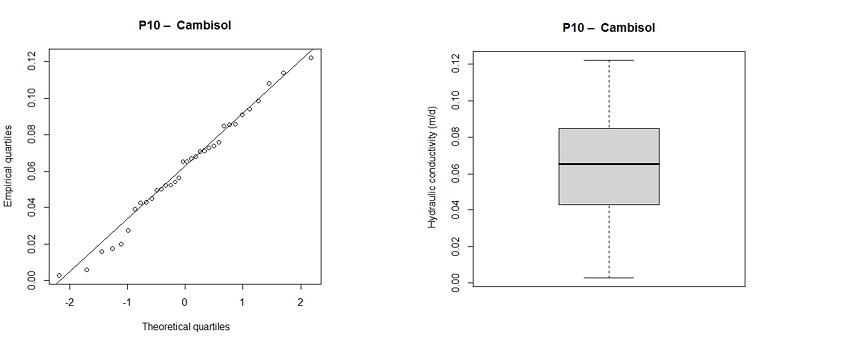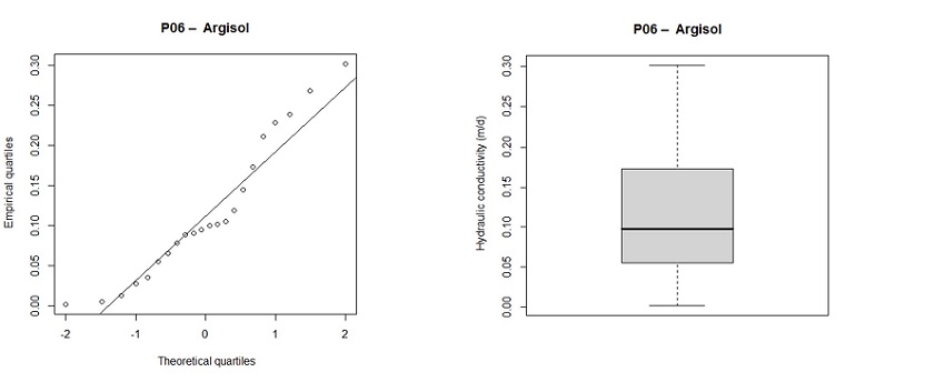 The Shapiro-Wilk test was applied for each soil class. Then, for soil classes that were normally distributed, graphs of the Boxplot type were drawn, in order to compare sample quartiles with those of the normal distribution. For the samples that were not normally distributed, the natural logarithm was applied to each Ksat value. Boxplot graphs were used in the study of the variability of the measurements.