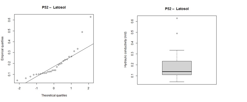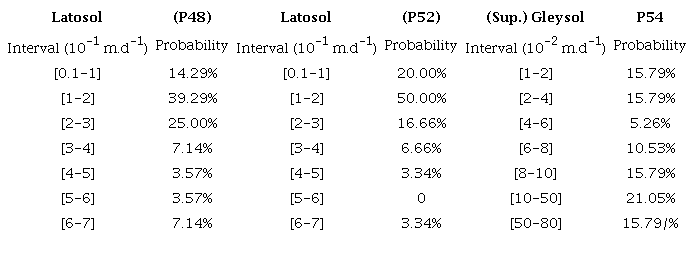 The values listed in Table 6 show that for Latosols samples P48 and P52 there is the probability of 85.72% and 96.55%, respectively, to obtain Ksat values in the interval of 0.1 x 10-1 m/d and 4 x 10-1 m/d. For Gleysol samples P54, Ksat values fall in the 1 x 10-2 m/d to 80 x 10-2 m/d interval.