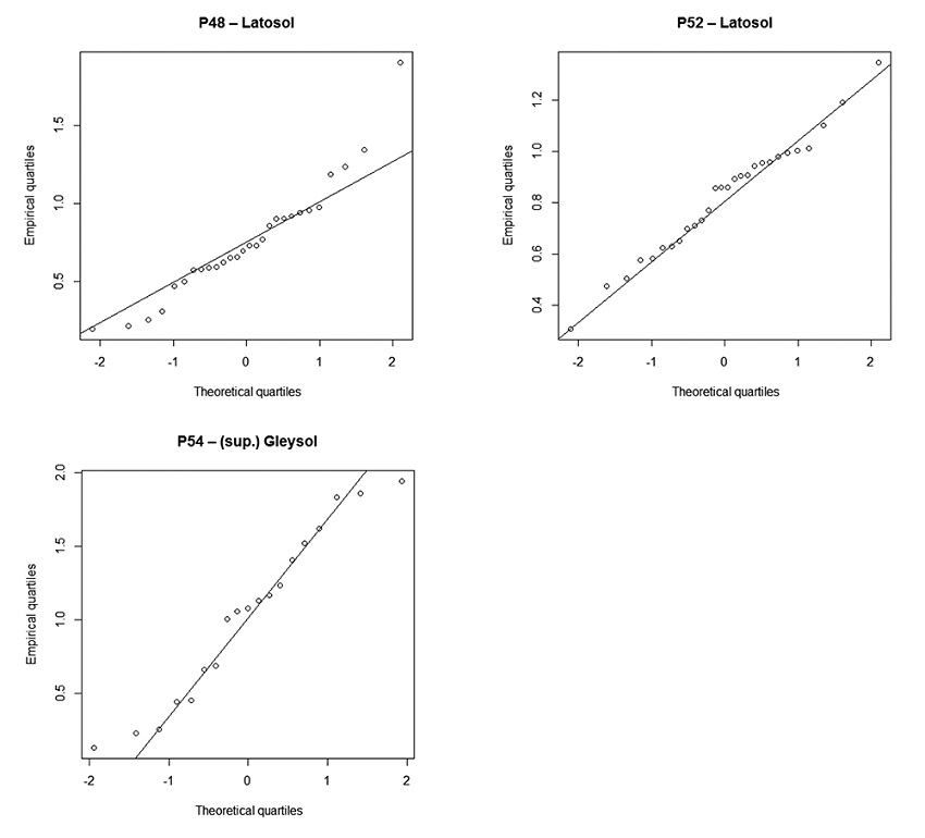 The log-normal distribution was used to describe soil properties that are positively asymmetric. Positively asymmetric distributions are a consequence of the fact that many environmental variables cannot assume negative values, thus starting from zero (Parkin & Robinson 1993). It can also be applied in situations where the log-natural transformation generates a normal distribution, that is, variable X (continuous) will have a log-normal distribution when Y = ln (X) (Walpole et al. 2009).