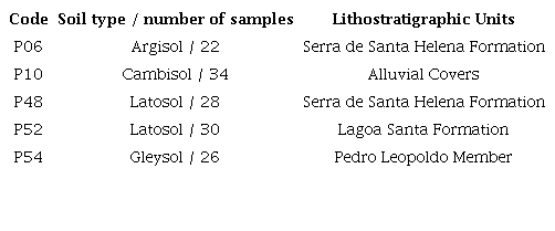 The soil types that predominate in the Lagoa Santa APA are: dark-red alic Latosol and red-yellow distrophic podzolic in the Lagoa Santa municipality; red-yellow distrophic podzolic in the Pedro Leopoldo municipality; red-yellow alic podzolic and dark-red alic Latosol in Matozinhos; and, dark-red alic Latosol and alic Cambisol in Funilândia (Kohler 1989).