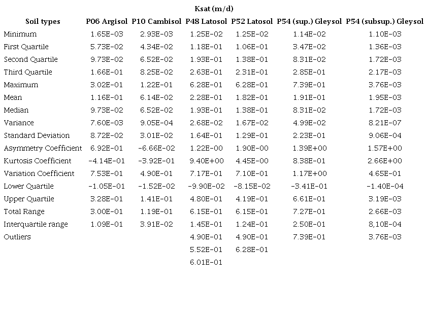 The high differences between mean and median values, interquartile range, total range, standard deviation, variation coefficient, kurtosis coefficient, and asymmetry coefficient show that the probability distribution of Ksat is not normal, even if the analyses were made with a small number of samples. The total range for the soil groups is approximately three times higher than the interquartile range, which indicates the existence of values very distant among themselves, despite being less frequent. The analysis of quartiles shows that the results are closer to the lowest values, because the upper quartile is much lower than the maximum value and the lower quartile is much higher than the minimum value and 50% of the data fall between these quartiles. The statistical distribution is normal for some groups of soil samples; however, considering all the samples of the study area, the statistical distribution of the data is not normal. Therefore, more appropriate statistical tests are the non-parametric, because they do not depend on the data statistical distribution.