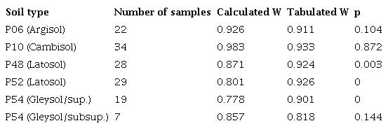 As stated before, two hypotheses were formulated for the soil types: H0: the sample comes from a normal distribution; H1: the sample does not come from a normal distribution. Applying the Shapiro-Wilk test to a significance level of 5%, W values were obtained as shown in Table 3.