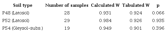 The Shapiro and Wilk test (1965) was applied to check whether the distribution of the samples is normal. Two hypotheses must be formulated for the test to be performed: in H0, the sample comes from a normal distribution; in H1 the sample does not come from a normal distribution. Then, the significance level is determined (it can vary from 0 to 1) and the test statistic (W - Equation 5) is calculated. By means of an interpolation or with the aid of a software, it is checked whether p (probability obtained by interpolation) is greater than the significance level defined initially; if yes, the null hypothesis is accepted (Shapiro & Wilk, 1965).