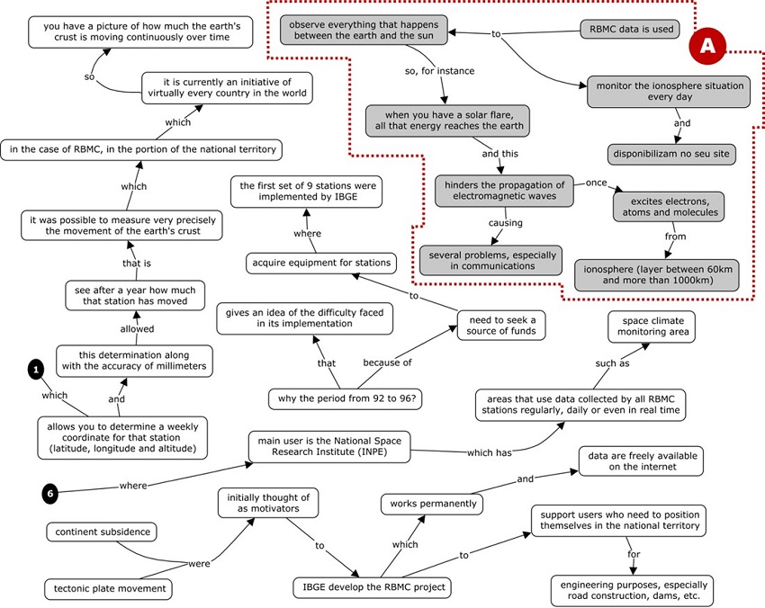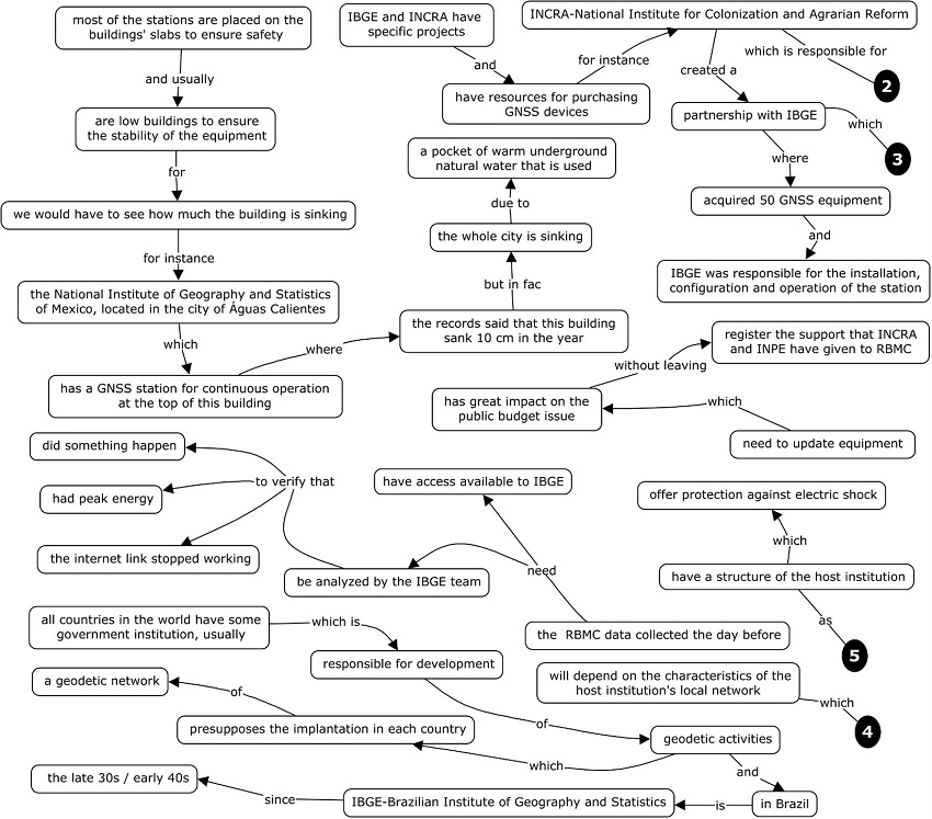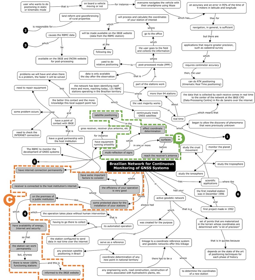 The resulting formulation and structuring of Brazilian Network for Continuous Global Navigation Satellite System Monitoring (RBMC) is consolidated in the concept maps shown in Figures 2 through 4. Note that the original concept map is divided into 3 (three) parts in order to permit visualization and interpretation of the concepts, linking phrases and existing connectors.