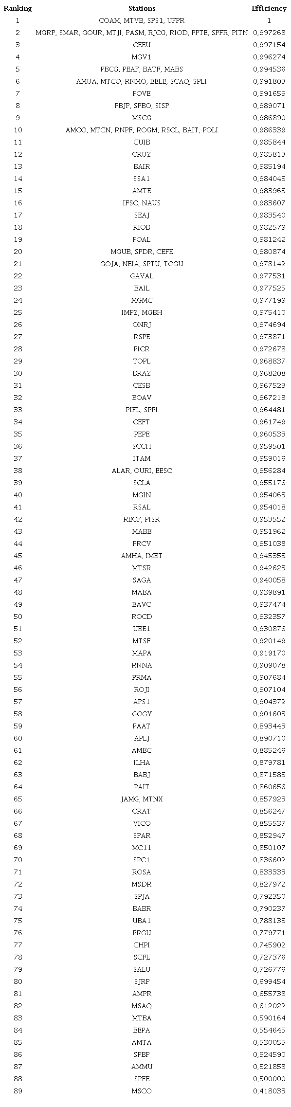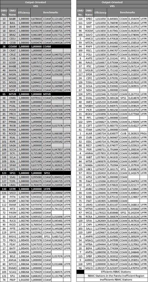 The DEAFrontier software uses Excel Solver as a mechanism to solve Data Envelopment Analysis models. It is important to report that numeric weight restrictions were not introduced in the models. In determining the RBMC’s goals and indicators, each station is represented as a decision making unit (DMU) with autonomy. In addition to choosing variables and DMUs, DEA modeling requires the choice of the model, either in relation to orientation or return to scale. In this case study, we used the DEA VRS model with oriented output.