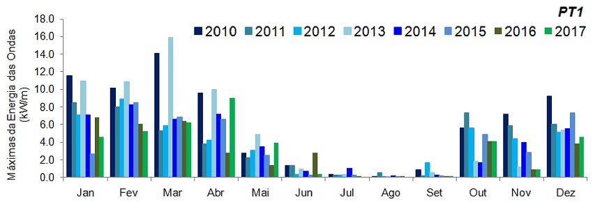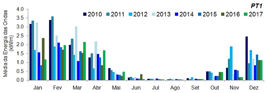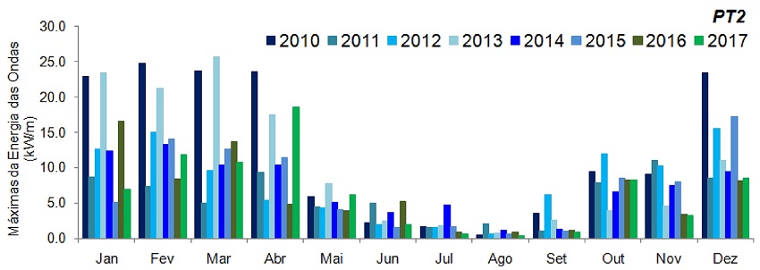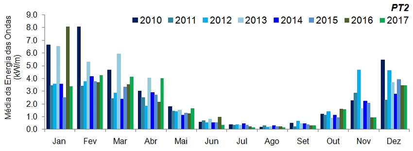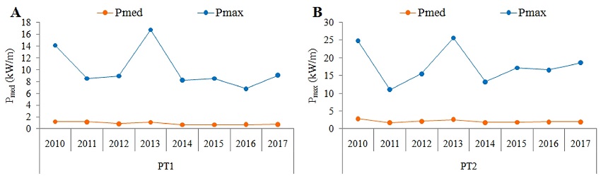 Em termos de variabilidade interanual do potencial de energia das ondas, os anos de 2010 e 2013 foram considerados os mais energéticos, tanto as análises médias quanto as máximas, para o PT1 = 3,56 kW/m e 16,7 kW/m, e para o PT2 = 8,22 kW/m e 25,9 kW/m.