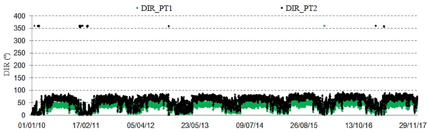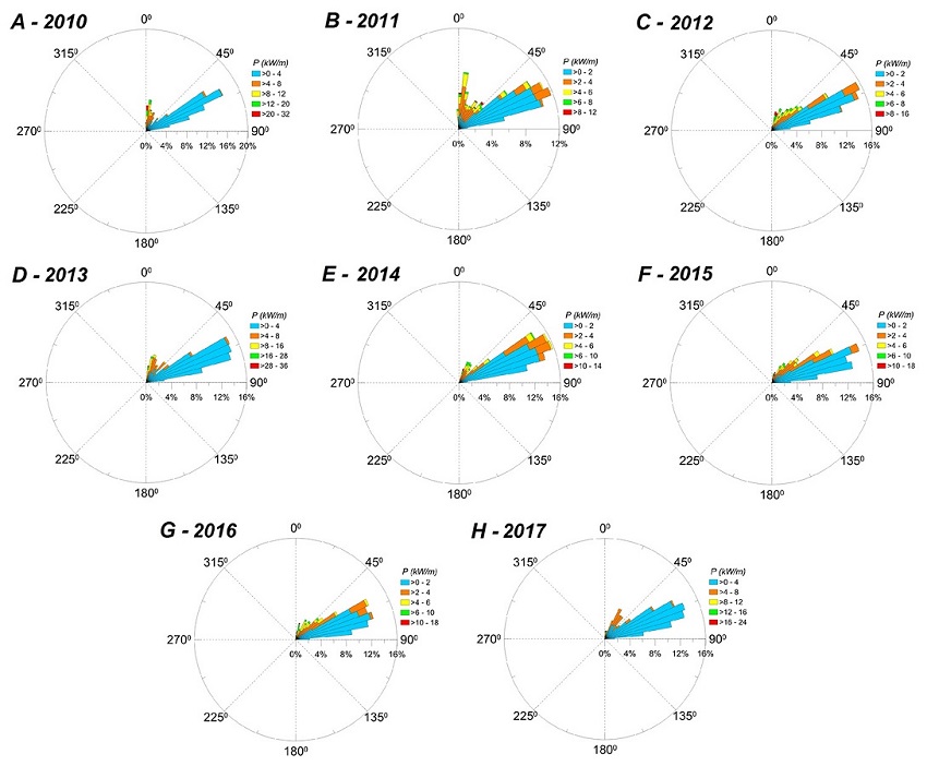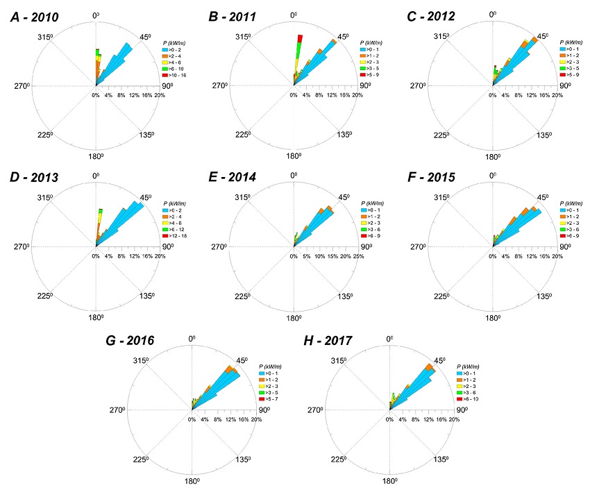 Também se pode avaliar entre as estações costeiras que no PT1, os baixos valores do potencial de energia se propagam com mais intensidade de NE em todos os anos, enquanto que no PT2 são predominantes de ENE.